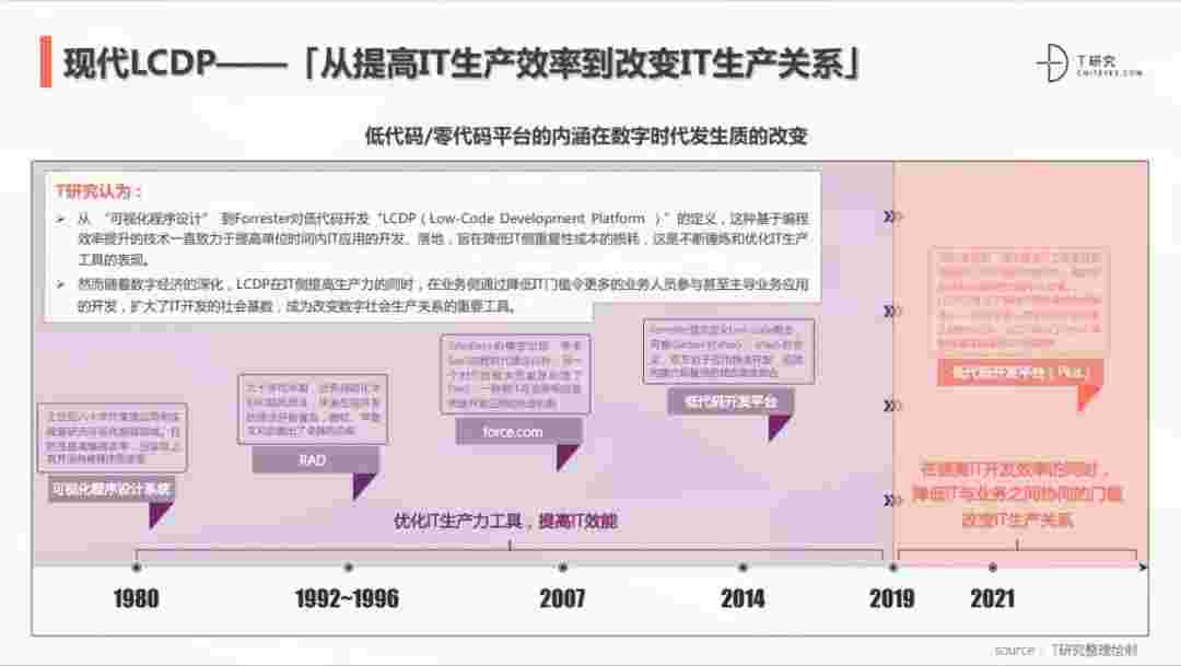 2020年前后,,,,,,源于提高IT工作者开发效能的LCDP不断进化和衍生,,,,,,面对业务导向日益明显的数字化变革。。。。。。LCDP衍生出了面向不同对象的升级服务——面向专业人群的LCDP和业务人群的NCDP,,,,,,,,,,,LCDP与NCDP的不同服务属性被逐渐认可和接受。。。。。。。。。。。。 LCDP在提高IT开发效率的同时,,,,,,,,,,降低IT与业务之间协同的门槛改变IT生产关系。。。。。。