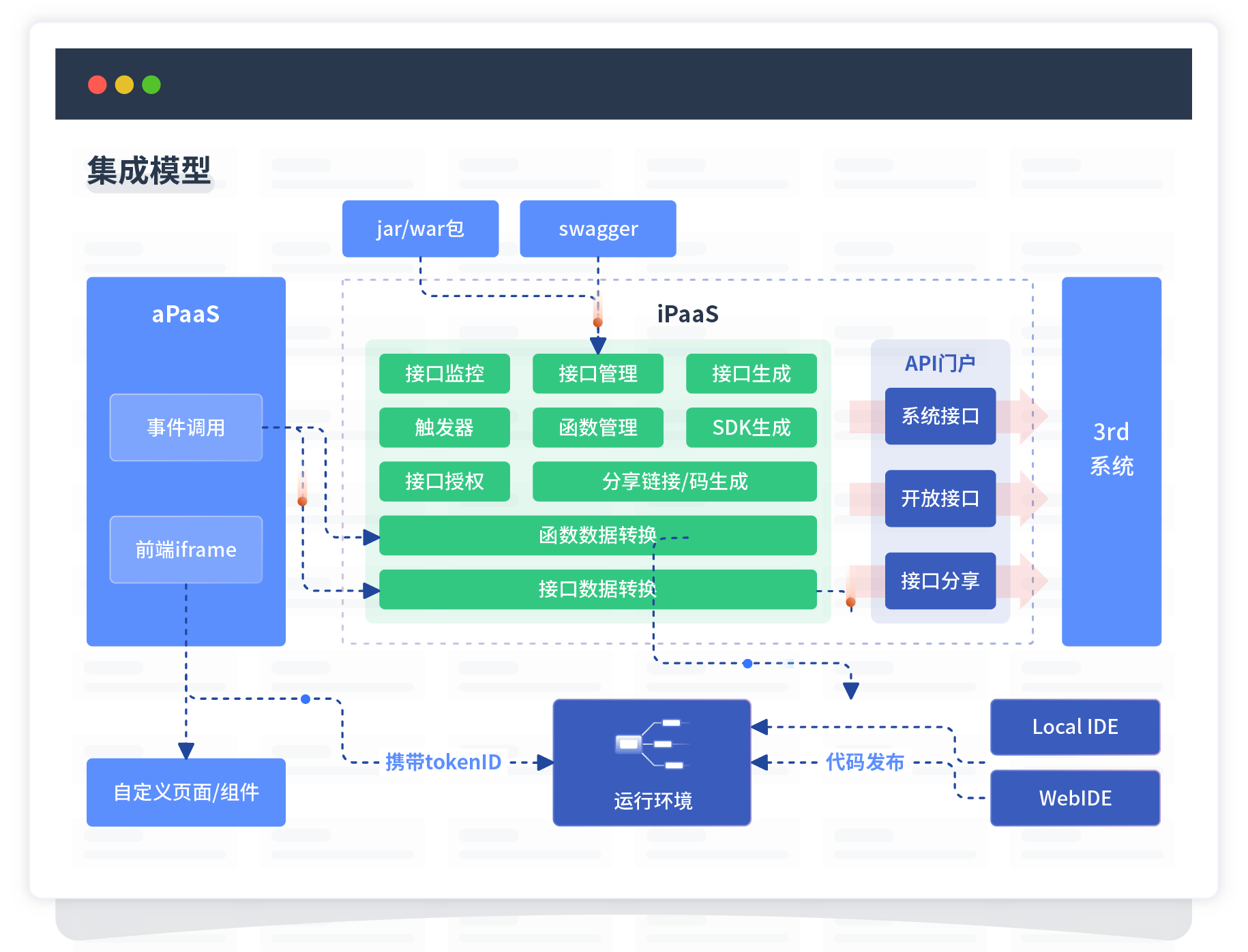 集成模型包括平台本身前、、、、、、、、、、、、、后端能力的扩展,,,,,,,也支持通过API门户和第三方系统进行交互。。。。。。。。。。