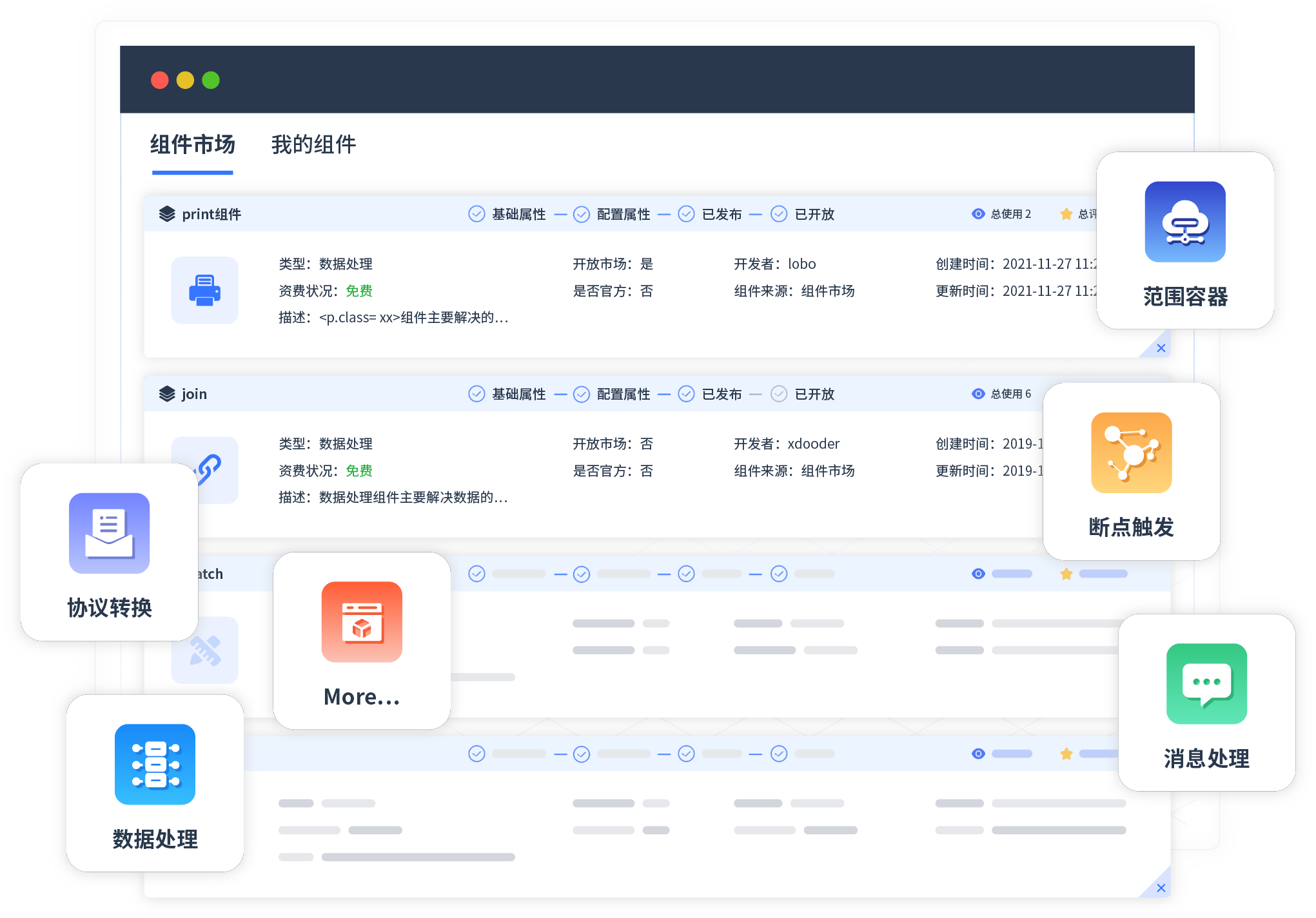 针对集成场景,,,,,,,,,,EBPAY提供组件市场,,,,,,,,,,例如协议转换、、、、、、、、、、消息处理、、、、、、、、、文件操作等。。。。。。。。。。。。除平台提供的组件外,,,,,,,,,客户可以自定义所需组件。。。。。。。。。