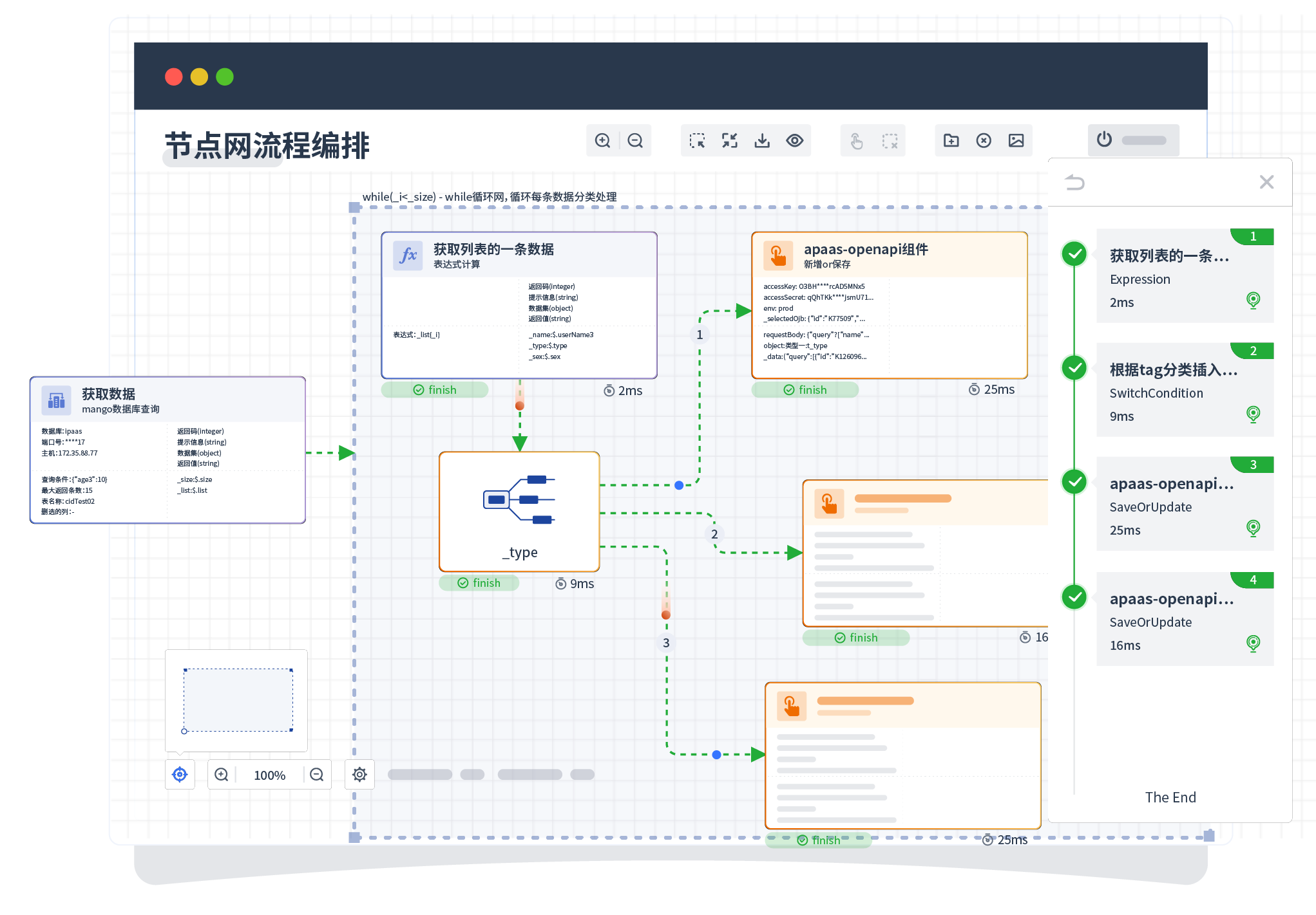针对集成场景,,,,,,,组件定义后支持进行流程编制,,,,不同于传统代码方式,,,,,,,,,,通过图形化展示,,,,,,,,支持在线调试、、、、、、、、、、、日志查看和运行回放。。。。。。。。。